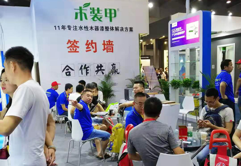 展位现场来访者不断,纷纷驻足咨询。我们现场的工作人员穿着醒目清新的蓝色战衣热情卖力为其介绍产品的特点,洽谈合作。3分钟干燥、4小时出货,水漆黑科技让广大家具、木门、木制品厂家出货速度提高10~20倍,VOCs处理费用变为0,更可以节约用地50%。各种特点惊艳亮相刷新大家的想象力,展会现场气氛高涨,签单不断!